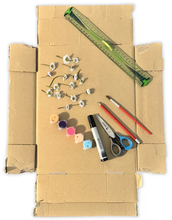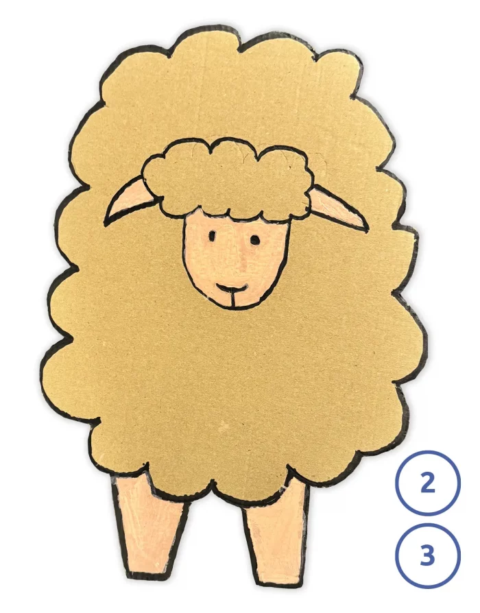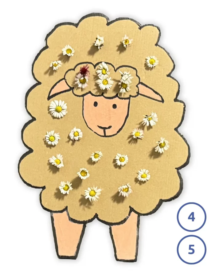 Escale junior Do it yourself Un mouton fleuri ! MATÉRIEL Un morceau de carton d’environ 40 x 50 cmCrayon de papierMarqueur noir Peinture (blanc, noir, rose…)Ciseaux20-30 pâquerettes du jardin Sur un morceau de carton, dessine un mouton au crayon de papier puis au marqueur.Peins le visage de la couleur de ton choix, sans oublier les yeux et la bouche. Laisse sécher et découpe le contour ; repasse les contours au marqueur noir. Fais des trous sur le carton avec la pointe d’un crayon. Va au jardin cueillir une vingtaine de pâquerettes (plus si tu as envie que ton mouton soit bien fleuri).Ton mouton est prêt !